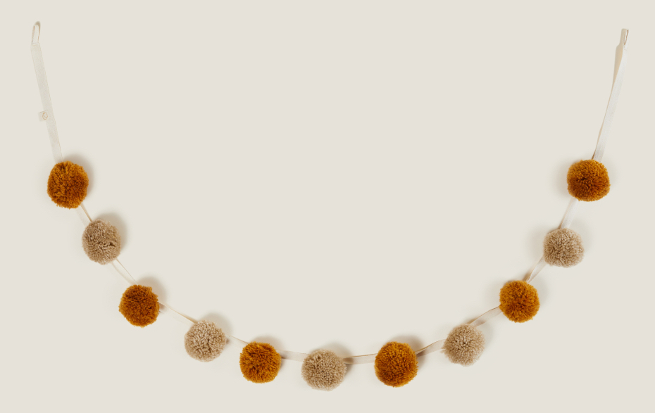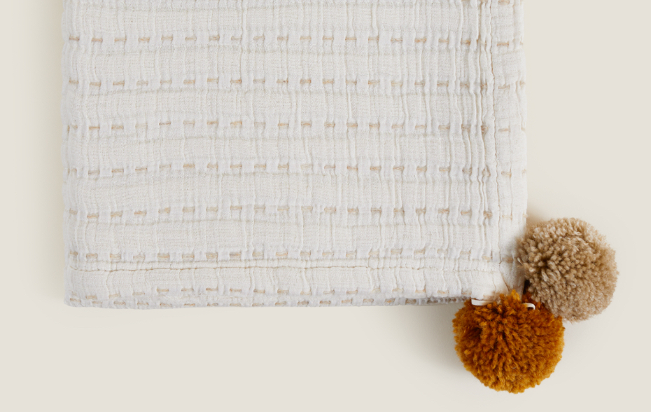 Um verdadeiro abraço! A manta leve, suave, com ponto de fio rústico de lã e pompons é perfeita para embalar o bebé nos dias frios de inverno.